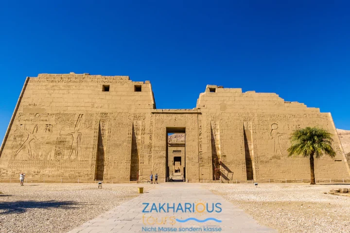 Zum Ende Ihres Ausflugs besichtigen Sie Medinat Habu. Medinat Habu ist ein Tempelkomplex, zu dem der Totentempel von Ramses III., der Amun-Tempel, die Grabkapellen der Gottesgemahlinnen des Amun aus der 23. bis 26. Dynastie und der Heilige See gehörten. Der Haupttempel ist gut erhalten und unter anderem bekannt durch seine Reliefdarstellungen des Sieges Ramses III. über die Seevölker zu Beginn des 12. Jahrhunderts v.Chr.